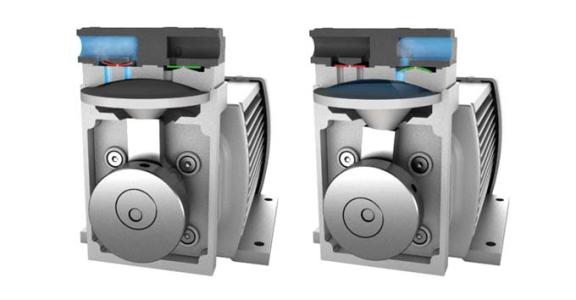 氣動雙隔膜泵一般有左右兩個對稱泵腔構成,在雙隔膜泵的兩個對稱工作腔中,各裝有一塊有彈性的隔膜片,連桿將兩塊隔膜連成一體,壓縮空氣從泵的進氣扣進人配氣裝置后,推動兩個工作腔內的隔膜片運動,驅使連桿連接的兩端隔膜片同步運動。與此同時,另一工作腔中的氣體則從其隔膜片的背后排出泵外,一旦到達行程終點,配氣機構則自動地將壓縮空氣引人另一工作腔,推動隔膜片朝相反方向運動,這樣就形成了兩個隔膜的同步往復運動。每個工作腔中又設置有兩個單向球閥,隔膜的往復運動,造成工作腔內容積的改變,迫使兩個單向球閥交替地開啟和關閉,從而將液體連續不斷地吸人和排出。氣動雙隔膜泵相對單隔膜泵流量較大,廣泛應用在化工、污水處理、醫藥等行業。